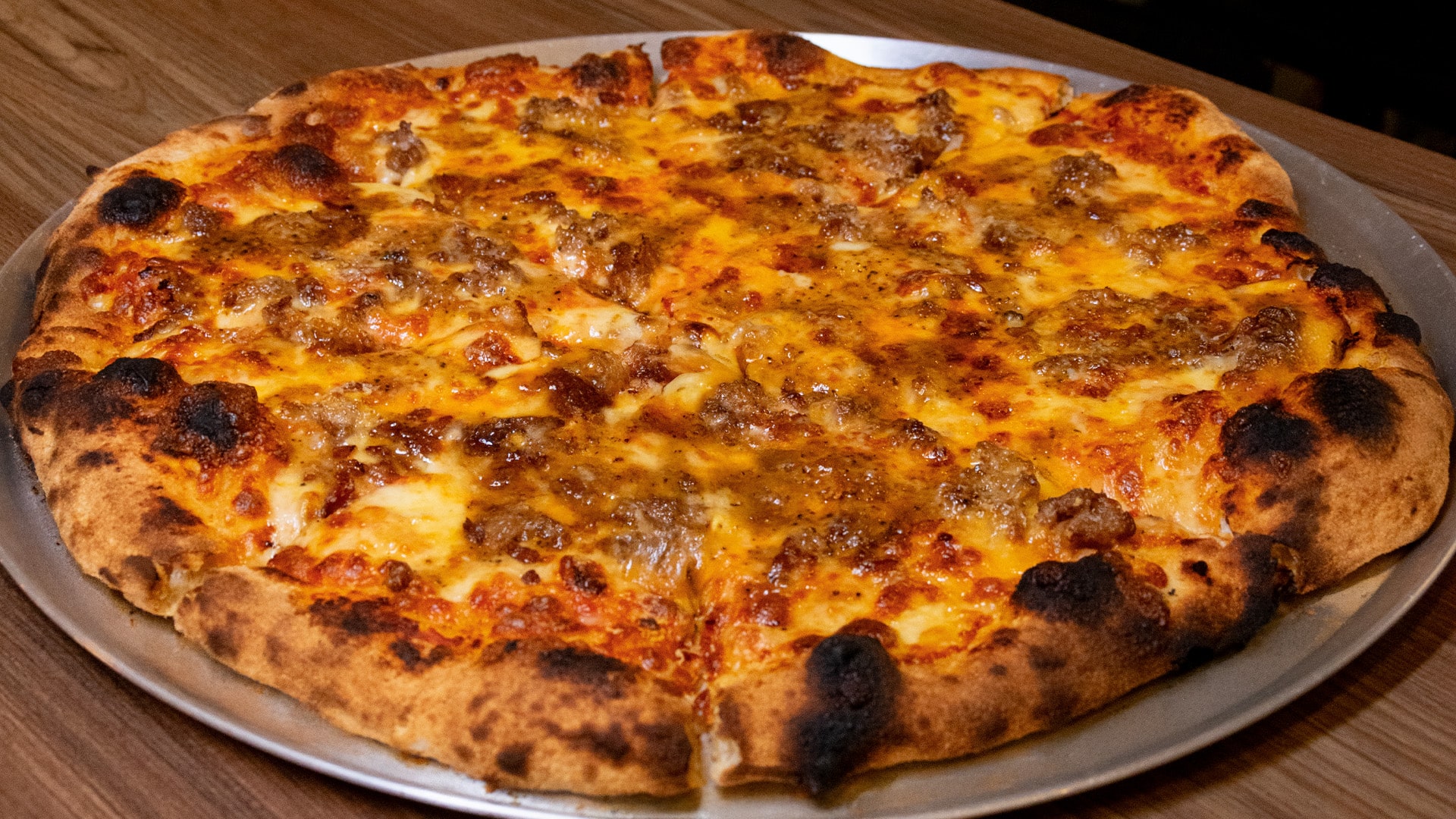 Especialidad de la casa con tocino eslovaco ahumado de autor aceitunas negras salsa marinara y mozzarella